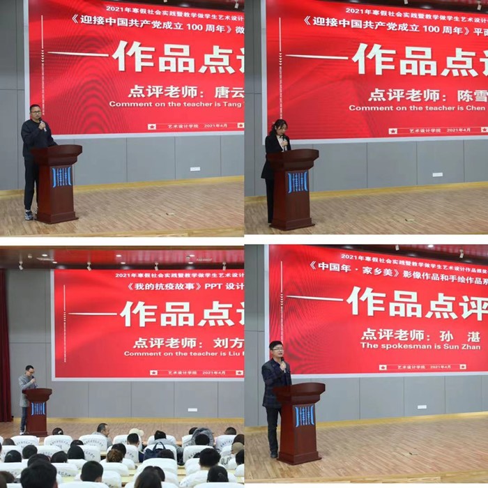 颁奖大会在艺术设计学院党总支书记韩飚的致词中拉开帷幕,按照寒假社会实践活动的各个项目,分作品分享和颁奖两个环节进行。在分享环节中,《我的抗疫故事》PPT设计大赛、《中国年·家乡美》影像作品和手绘作品比赛、《迎接中国共产党成立100周年》微视频和平面作品制作比赛等获一等奖作品的作者登台展示了自己创作的作品,并向全体师生介绍了自己的创作构思;刘方义、孙湛、陈雪影、唐云龙等教师现场对作品进行了点评。韩飚、吴昊等学院班子成员及各教研室主任为获奖学生颁奖,郑伟、黄义兵、杨卫宏等嘉宾分别为获奖班集体、优秀指导教师、优秀辅导员颁奖。整个颁奖活动简朴而隆重,师生们在思想建设、课程思政、专业技能应用、两个课堂的结合、学习方式等方面进行了有益的交流。