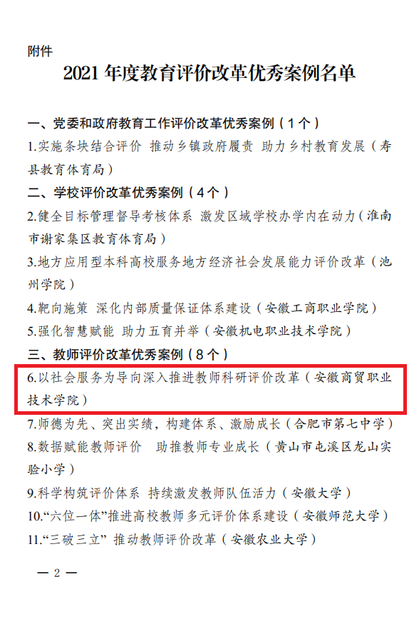 8月20日,安徽省教育厅公布2021年度全省教育评价改革优秀案例名单,我校《以社会服务为导向深入推进教师科研评价改革》案例成功入选。此次评选活动共遴选全省各地各校118个推荐案例,34个案例入选教育评价改革优秀案例,其中包含6个高职院校的优秀案例。