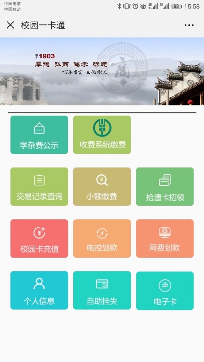 6、打开“ky体育app官方微服务” 【一卡通】进入一卡通应用微导航首页,可查询个人基础信息,自助挂失,电控转账、校园卡圈存(目前仅限农行)、交易记录查询、学杂费费用公示、学杂费自助缴费、电子卡(校园一卡通虚拟卡,与实体卡共用钱包)等。