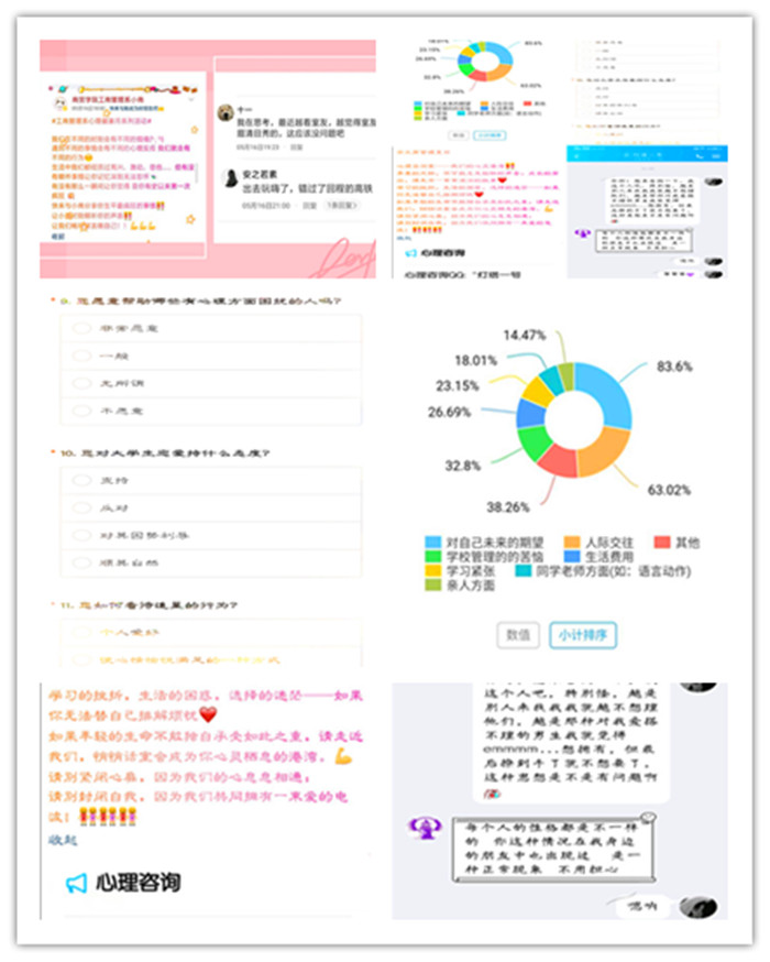 在新时代互联网+环境下,因互联网具有虚拟性、开放性以及匿名性等特点,青年大学生可以尽情地利用互联网工具表达和发泄自己内心真实的想法。基于此,我系通过开展心理健康问卷调查、新媒体平台互动、心理咨询直通车等一系列线上心理健康教育活动,使大学生能真正敞开心扉,分享最真实的心理故事,向同学和老师诉说真“心”,实现更有效的人文关怀和心理疏导,助力学生心理健康发展。