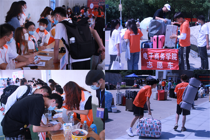 考虑到家长因疫情防控止步于门外、学生行李多负担重的问题,电子商务学院特意安排了150名学生志愿者帮助新生运送行李、指引路线和安排住宿等。身着统一橘色T恤的志愿者们忙碌地穿梭在人群之中。同一时间,在体育馆新生接待处,学院领导、老师和志愿者们早早地来到现场有序组织接待事宜,以热情饱满的态度面对每一位电商学子。党员同志们自觉坚守在迎新第一线,在社会实践与志愿服务中践行初心使命,充分发挥了党员的先锋模范作用,积极响应了“我为师生办实事”的号召,让新生感受到电商人的温暖与关怀。