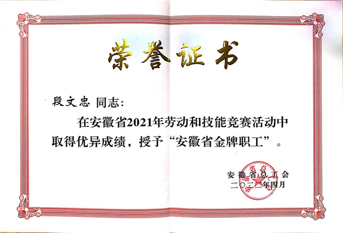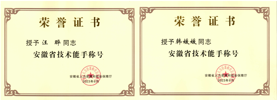 图9 汪晔、韩媛媛获安徽省技术能手称号