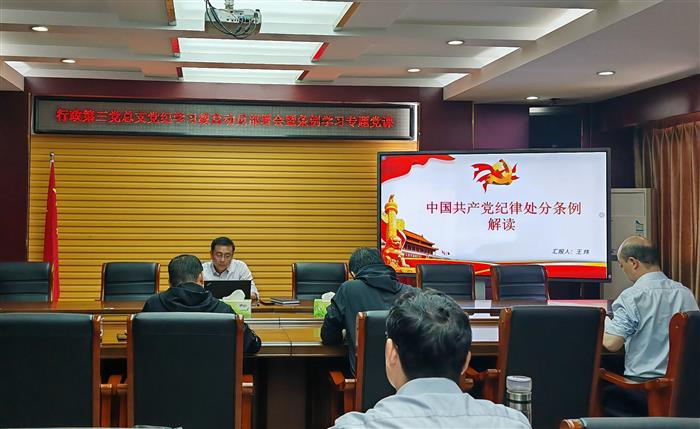 为了深入推进学习贯彻习近平新时代中国特色社会主义思想主题教育,营造“以学正风”的政治生态,党委副书记王炜在弘商楼第二会议室为行政第三党总支全体党员上党纪学习教育专题党课,讲座由行政第三党总支书记孙握瑜主持。