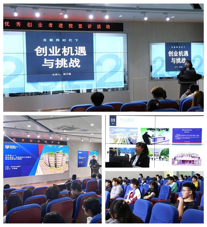 10月-11月,为提升大学生的创业意识、激发创业热情,校创新创业学院开展优秀创业者进校园宣讲系列活动,学院组织22级、21级近百名同学积极参与。先后聆听武汉牧书文化传媒有限公司合伙人、芜湖整点文化传媒有限公司创始人、芜湖玩咖网络科技有限公司总经理,学院优秀毕业生郭子薇主题为《互联网时代下的大学生创业机遇与挑战》的讲座和南洋理工大学副研究员、研发工程师、苏州斯普尼克卡门科技有限公司创始人罗睿康博士主题为《创在南洋:科技创业与出海东南亚的机遇与挑战》的讲座。在聆听校友、专家的讲座后,同学们纷纷表示“作为当代大学生,要有‘初生牛犊不怕虎’的精神、热情、干劲,学习能力强、社会意识强,这些都是创业者应该具备的素质,也成为了创新创业的动力。在学好专业知识的同时,应该将创新素养有效应用,在大赛和实践中有效提升自我,更好实现自己的社会价值。”