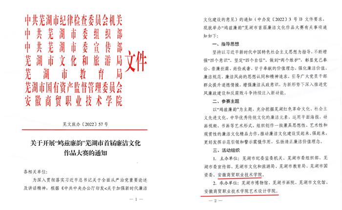 为进一步提升大赛优秀作品宣传影响力,7家主办单位首批遴选出书画、非遗文创、视频、海报在内的百余幅优秀作品,自1月22日(大年初一)起,在芜湖市博物馆一楼展厅面向社会各界进行为期两个月的展出。借助文化作品所承载的廉洁价值理念,使观众在美的享受中进一步感受廉洁的价值、文化的力量,不断实现干部清正、政府清廉、政治清明、社会清朗。校艺术设计学院将以此次大赛承办为契机,进一步推进与各级政府单位的合作,提升社会服务能力,为学校办学影响力的提升贡献力量。