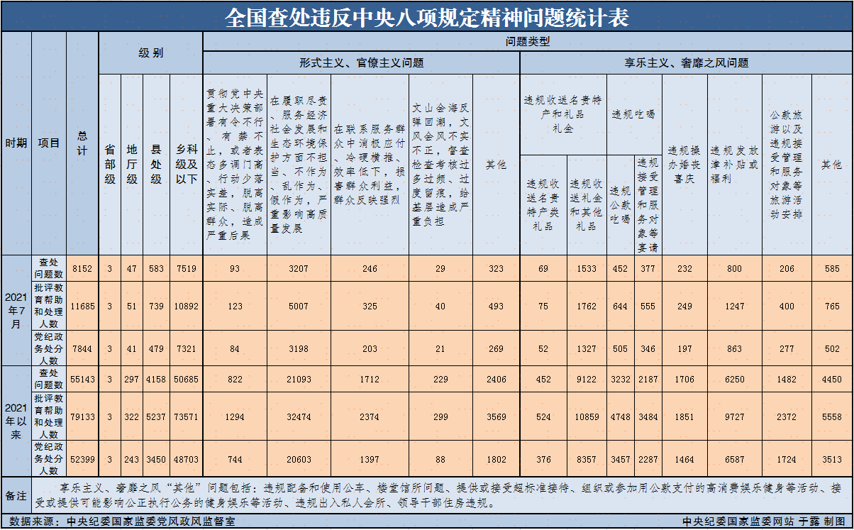 8月26日,中央纪委国家监委公布了2021年7月全国查处违反中央八项规定精神问题汇总情况。当月,全国各级纪检监察机关共查处违反中央八项规定精神问题8152起,批评教育帮助和处理11685人,其中党纪政务处分7844人。这是中央纪委国家监委连续第95个月公布月报数据。