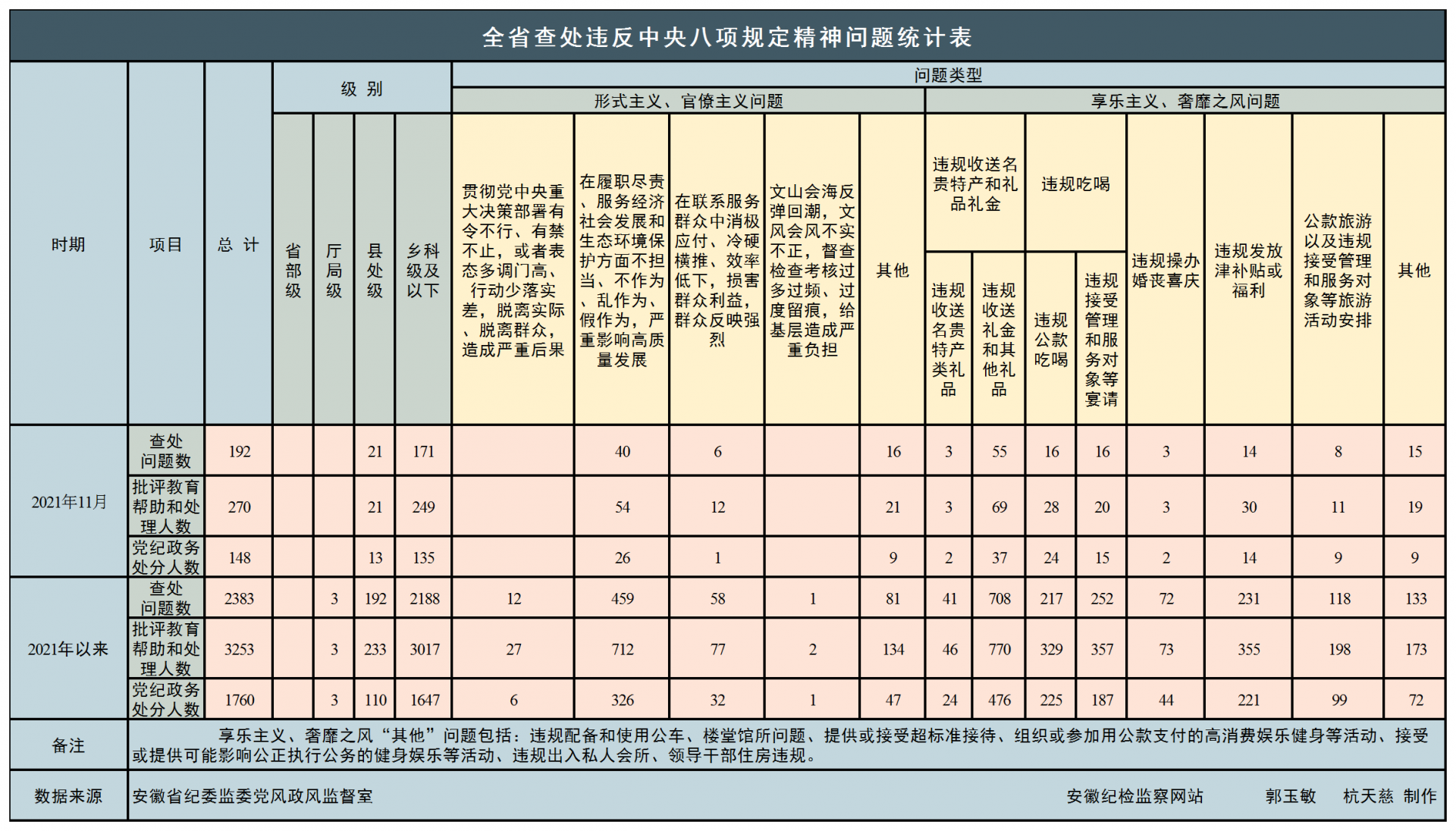 2021年11月,全省纪检监察机关共查处违反中央八项规定精神问题192起,批评教育帮助和处理270人,其中给予党纪政务处分148人,同比分别上升9.7%、13.9%、42.3%。