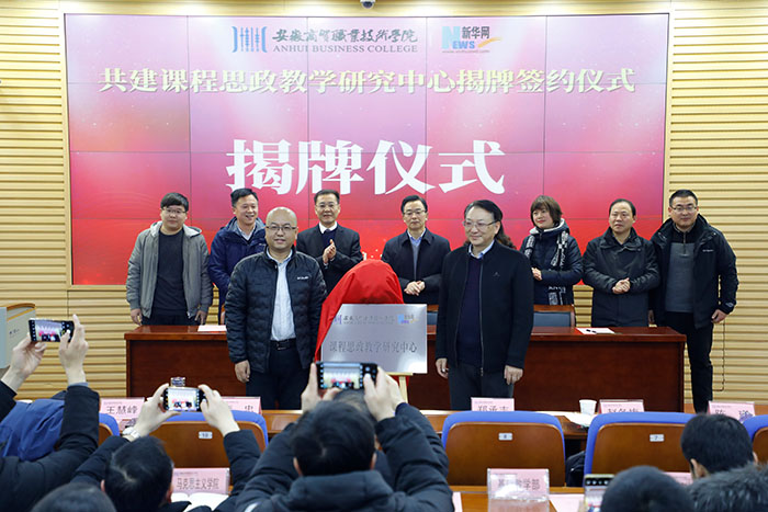 1月5日,我校与新华网共建课程思政教学研究中心签约揭牌仪式在录播室举行。校党委书记章顺来、党委副书记、校长李忠,党委委员、副校长郑承志,新华网总裁助理姚予疆、新华网教育事业中心院校合作部副总监王慧峰、商务经理郭鹏飞、新华网安徽省教学服务中心主任武迪安出席会议,学校教务处、人事处、办公室、各二级教学单位等相关部门负责人及教研室主任参加签约仪式。安徽师范大学教务处副处长赵冬梅、教学资源建设中心主任陈琪作为特邀嘉宾出席。