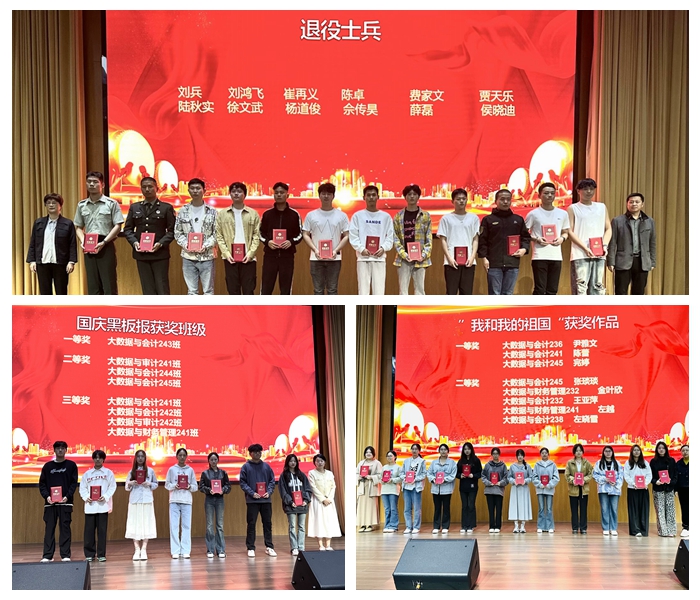 会计学院党总支书记王珠强和院长鲁学生为会计学院在校就读的退役士兵颁发荣誉证书。会计学院办公室主任程慧和团总支负责人刘诗捷为“我和我的祖国”获奖作品和国庆黑板报获奖班级颁发证书。