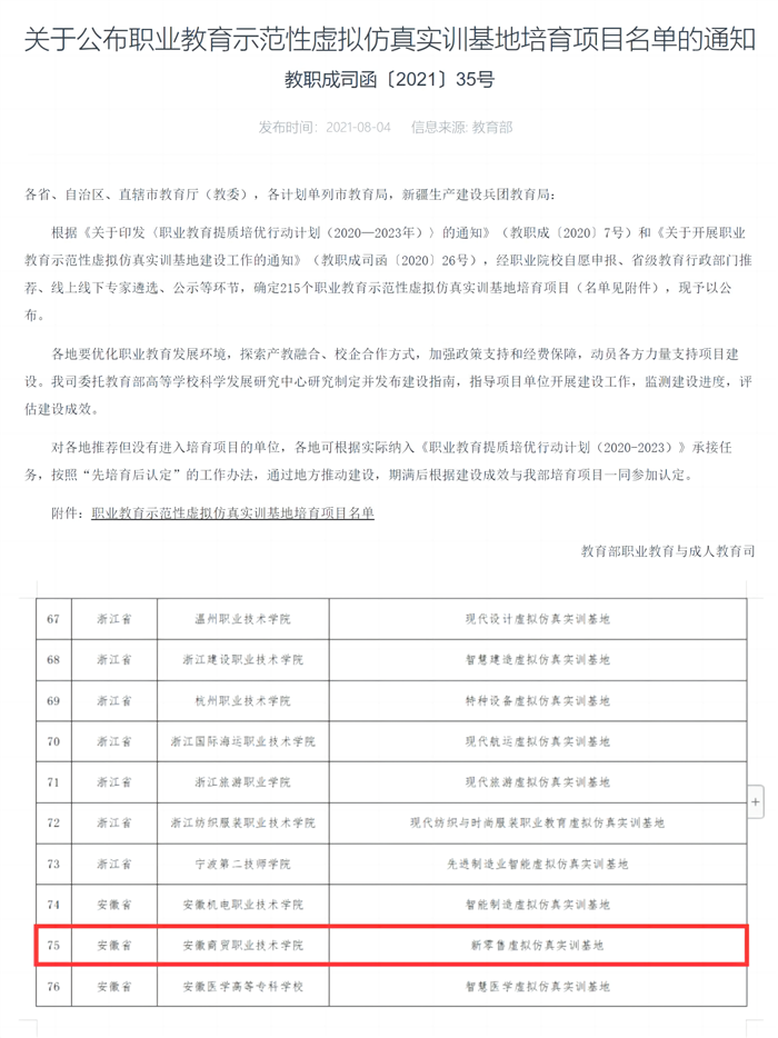 图21 学校新零售虚拟仿真实训基地入选教育部建设项目
