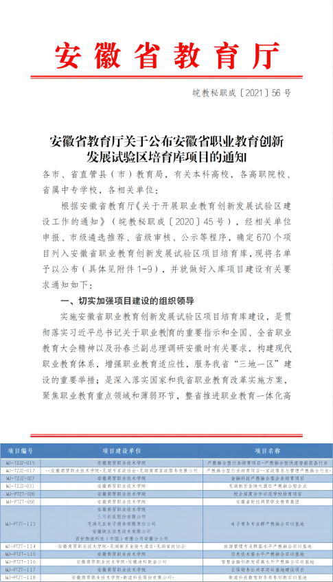 图25 学校多个项目入选安徽省职业教育创新发展试验区项目培育库