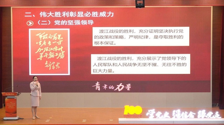 芜湖市青年讲师团成员、学校马克思主义学院教师林霁月以《不忘初心跟党走奋勇争先立潮头》为题讲述了渡江第一船的由来、伟大胜利彰显必胜威力、伟大精神展现时代价值、争做新时代“渡江先锋”等内容,激发大家思考如何为时代发展贡献青春力量,取得了很好的宣讲效果。