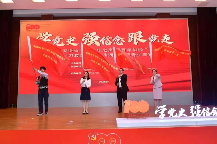 4月16日下午,安徽省“扬青年之声 颂百年华诞”青少年党史学习教育宣讲暨芜湖市首场青少年宣讲报告会在芜湖职业技术学院举行,团省委副书记郑兰荣,市委常委、秘书长、宣传部部长张志宏出席,并为芜湖市青少年党史学习教育宣讲团授旗。市委宣传部、团市委、市委讲师团、市委史志室、市教育局、市文旅局、芜湖传媒中心负责同志参加宣讲会。200余名大学生、少先队员代表聆听了本次宣讲。