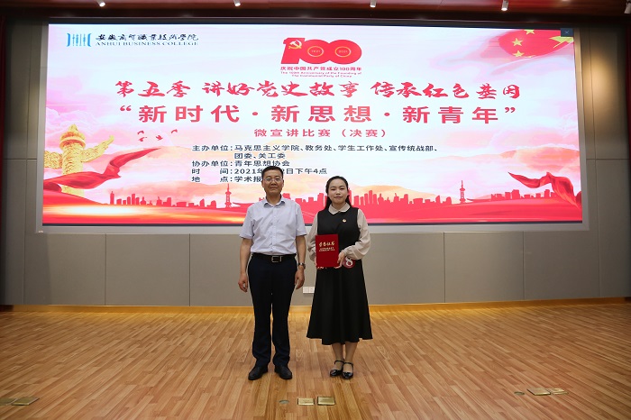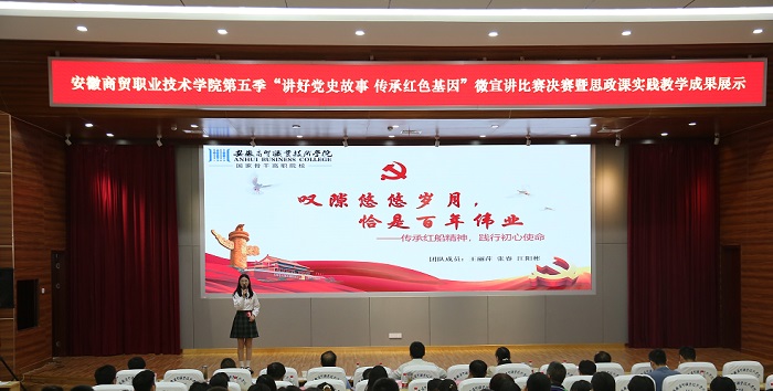 “今年是建党一百周年,习近平总书记指出,历史川流不息,精神代代相传。我们要继续弘扬光荣传统、赓续红色血脉,永远把伟大建党精神继承下去、发扬光大!今天八位选手讲述的党史故事有的虽然很小,但小中见大;有的虽然很细,但细中见真。这些故事富于历史的温度,为我们呈现了党史中许多感人的细节,让我们感受到温暖的真情;这些故事也富于思想的高度,同学们对党史故事背后所蕴含的“红色精神”分析地鞭辟入里;同学们的讲述更富于现实的热度,不仅讲述党史故事,而且还为我们讲述了当下的中国故事。通过本次比赛,我感受到了商贸学子真切的政治热情、高涨的爱国热情、拳拳的爱党热情!”这是7月2日下午我校马克思主义学院会同教务处、宣传统战部、学生工作处、团委、关工委等部门共同举办的第五季“讲好党史故事 传承红色基因”微宣讲比赛暨思政理论课实践教学成果展示活动现场,决赛评委、安徽师范大学马克思主义学院副院长、硕士生导师赵冰老师饱含激情的评价。本次活动历时两个多月,凝聚了我校思政课教师和学生的汗水与心血,是我校学生用拳拳的爱国行动为党的百年华诞献礼,也是我校马克思主义学院将学党史学理论融合互促,推动党史学习教育创“新”更走“心”的强有力展示。
