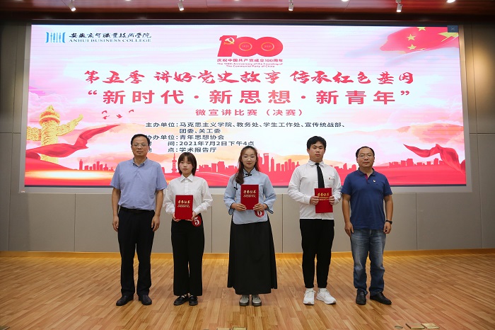 2021年7月2日下午,第五季“讲好党史故事传承红色基因”微宣讲比赛暨思政理论课实践教学成果展示活动在学术报告厅拉开了帷幕。学校党委副书记、纪委书记朱光应,党委委员、副校长郑承志,安徽师范大学马克思主义学院副院长赵冰、芜湖职业技术学院马克思主义学院院长杨婉玲、安徽机电职业技术学院马克思主义学院院长徐生、我校相关职能部门负责人及有关领导,学校全体专兼职思政课教师以及决赛班级的学生代表出席了此次活动。