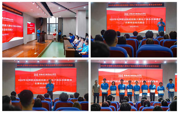 总结提升,扬帆起航。为进一步总结志愿服务工作,提升服务水平,在交流会上,学生志愿者代表唐国顺同学通过时间轴分享了国赛志愿服务期间的真情实感,表示越是基础、越是细微的工作,越需秉持高度的责任心与持久的耐心;教师志愿者代表张爱兵老师从感动、感谢、行动三个方面交流了工作体会,希望以此为契机,将勇于担当、甘于奉献的火种播撒到商贸校园的每一个角落,为学校的发展壮大添砖加瓦。会上,电商学院党总支副书记兼副院长汪晔为志愿者们颁发了荣誉证书。