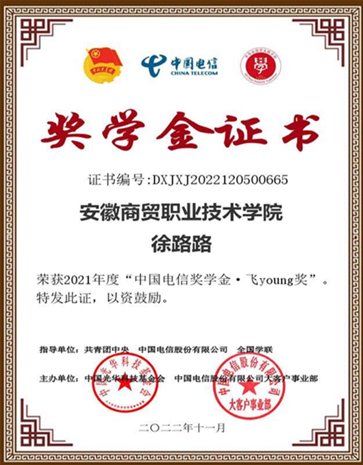 近日,由共青团中央、中国电信集团有限公司、全国学联联合开展的2021年度“中国电信奖学金”遴选结果正式揭晓,我校大数据技术与应用191班徐路路同学获得“中国电信奖学金·飞Young奖”。