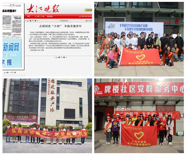 一体两翼,以大学生综合素质提升为主体,以社会实践志愿服务和各类文化体育竞赛为两翼,两翼齐飞,助力团员青年素质提升。社会是个大课堂,为促进团员青年对社会的了解,实现书本知识和实践知识的更好结合,树立勇担社会责任意识,系团总支与芜湖市卫计委举办“开展终结结核行动,共建共享健康中国”为主题的结核病防治宣传活动;与澛港街道开展了“世界水日进社区”宣传活动;与蚌埠市禹会区喜迎门社区开展法制宣传进社区等多种社会实践和志愿服务活动,其中《大江晚报》以“志愿清洗‘小绿’争做美德青年”为题报道了我校人文外语系与芜湖公共交通集团举办的志愿服务活动。
