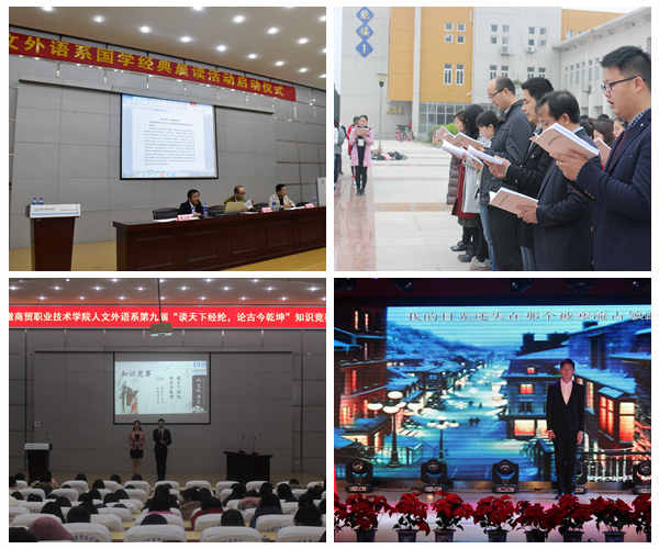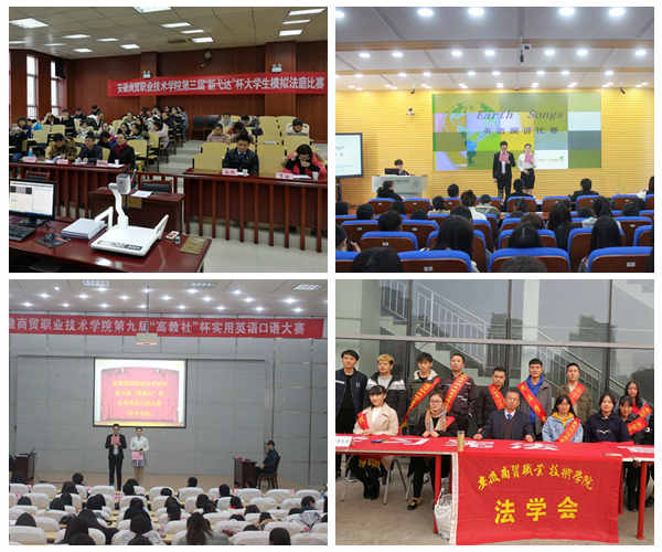一品二特,指人文外语系品牌活动“弘扬中华传统文化系列活动”和“法制宣传月”、“英语语言月”两个特色活动。为贯彻习近平总书记在全国高校思想政治工作会议上讲话精神,实现全程育人、全方位育人,系部党政领导紧密合作,从学生活动入手将学生专业技能训练和学生团学活动相结合,形成系部专业教师和团学部门齐抓共管的新局面。同时,充分发挥专业优势,依托文秘专业开展了“经典诗文朗诵会”、“传统文化知识竞赛”、“全系晨读国学经典”等活动,渐渐形成了系部品牌,并在今年学校“春之声”开幕式上进行了展示,获得师生的好评,体现了大学文化传承的功能。法制宣传月,将法律送进基层,开展了“法制宣传进社区”、“法律援助进社区”、“建立社会弱者法援中心”“大学生模拟法庭”等活动。英语语言月,主要是为了激发同学们学习英语、应用英语的兴趣和热情,开展了“实用英语口语大赛”、“英语翻译比赛”、“英语词汇竞赛”、“大学生英语演讲比赛”等活动。这些活动的开展,有效的动员了全系的资源来投入到青年学生的培养教育中去,初步形成了具有人文特色的文化品牌。
