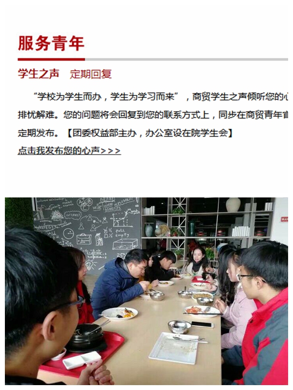 始终坚持围绕中心、服务大局的工作主线,发扬“党有号召、团有行动”的传统,及时把“党的群众路线”“三严三实”“两学一做”“管党治党宽松软”等教育实践活动的开展情况传递到共青团系统。组织团员青年学习学校第三次党代会精神、地方技能型高水平大学和创新发展行动计划项目建设方案、内部质量保证体系诊断与改进工作规划等,号召共青团系统将团学工作置于党政工作全局之中谋划推进,带领广大团员青年与学校发展同心同德,同向同行。引导青年参与学校民主建设,通过搭建“学子心声”平台、开展“倾餐汇”活动等形式倾听青年心声。