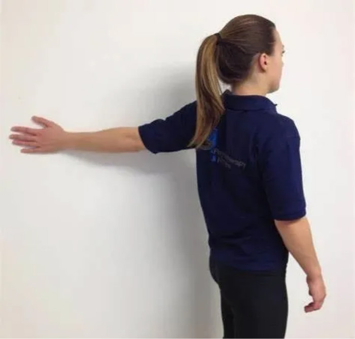 胸部拉伸:前臂水平向后伸直,靠墙。身体微微向前倾斜,旋转身体远离墙壁,直到感到胸部和肩膀前方有拉伸。如果在做这个练习的时候手臂保持伸直,那么更多伸展的是肩部而不是胸部。