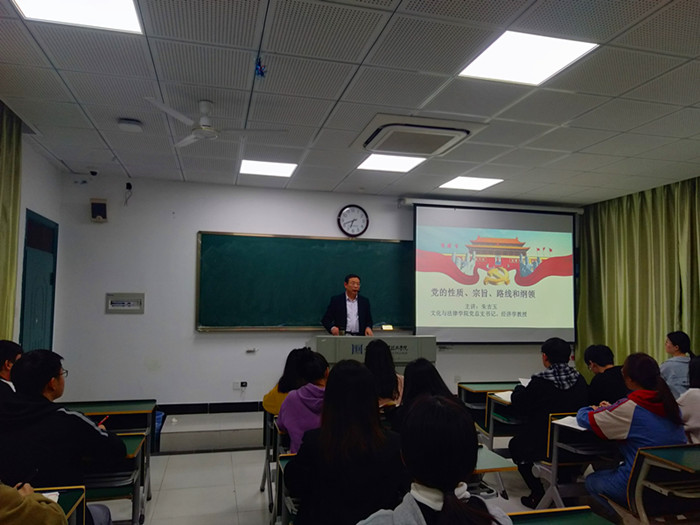 班主任首先对参加此次分党校培训的入党积极分子们表示了热烈祝贺,对来自各个班级的优秀分子汇聚一堂表示热烈欢迎,同时提醒大家与一名合格党员、优秀党员的距离还很远,大家需要不断学习、不断努力、不断提高。接着全场起立奏唱《国际歌》,铿锵有力、激动人心的歌声让在场的每一位学员都肃然起敬。第37期优秀学员代表张世豪上台发言,他分享了自己在疫情期间线上完成党校学习的深刻体会,呼吁同学们要珍惜学习机会,端正入党动机,要在思想上、目标上和行动中全心全意为人民服务,要向疫情中无数勇敢的逆行者们学习。接着,班主任向学员们介绍了党校的学习要求和考核办法等,重点强调了党校培训的纪律。最后,在学员们热烈的掌声中,文化与法律学院党总支书记朱吉玉老师为大家作题为《党的性质、宗旨、路线和纲领》的专题报告。
