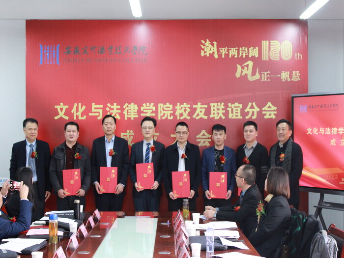 校纪委书记黄继胜和校友代表、第四届安徽省优秀青年律师金磊共同为文法学院校友联谊分会揭牌。