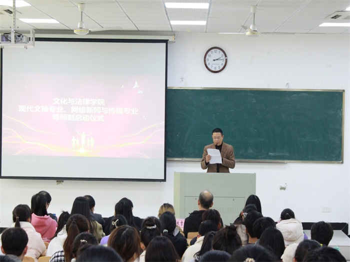 为落实立德树人根本任务,践行“三全育人”理念,文化与法律学院试点推行专业导师制,为21级现代文秘、网络新闻与传播专业的新生配备导师。12月8日下午2点,导师制启动仪式在笃学楼201教室举行。文化与法律学院党总支书记朱吉玉,院长王锦坤,副院长陈辉,文秘教研室、人文素养教研室全体教师及两个专业的21级全体新生出席此次启动仪式,仪式由陈辉主持。