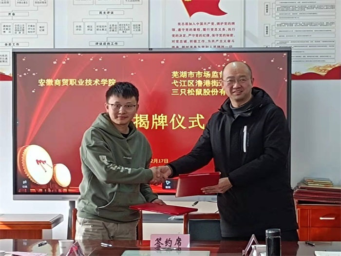 我校与芜湖市市场监督管理局、弋江区澛港街道办事处、三只松鼠股份有限公司举行政产学研战略合作签约、揭牌仪式