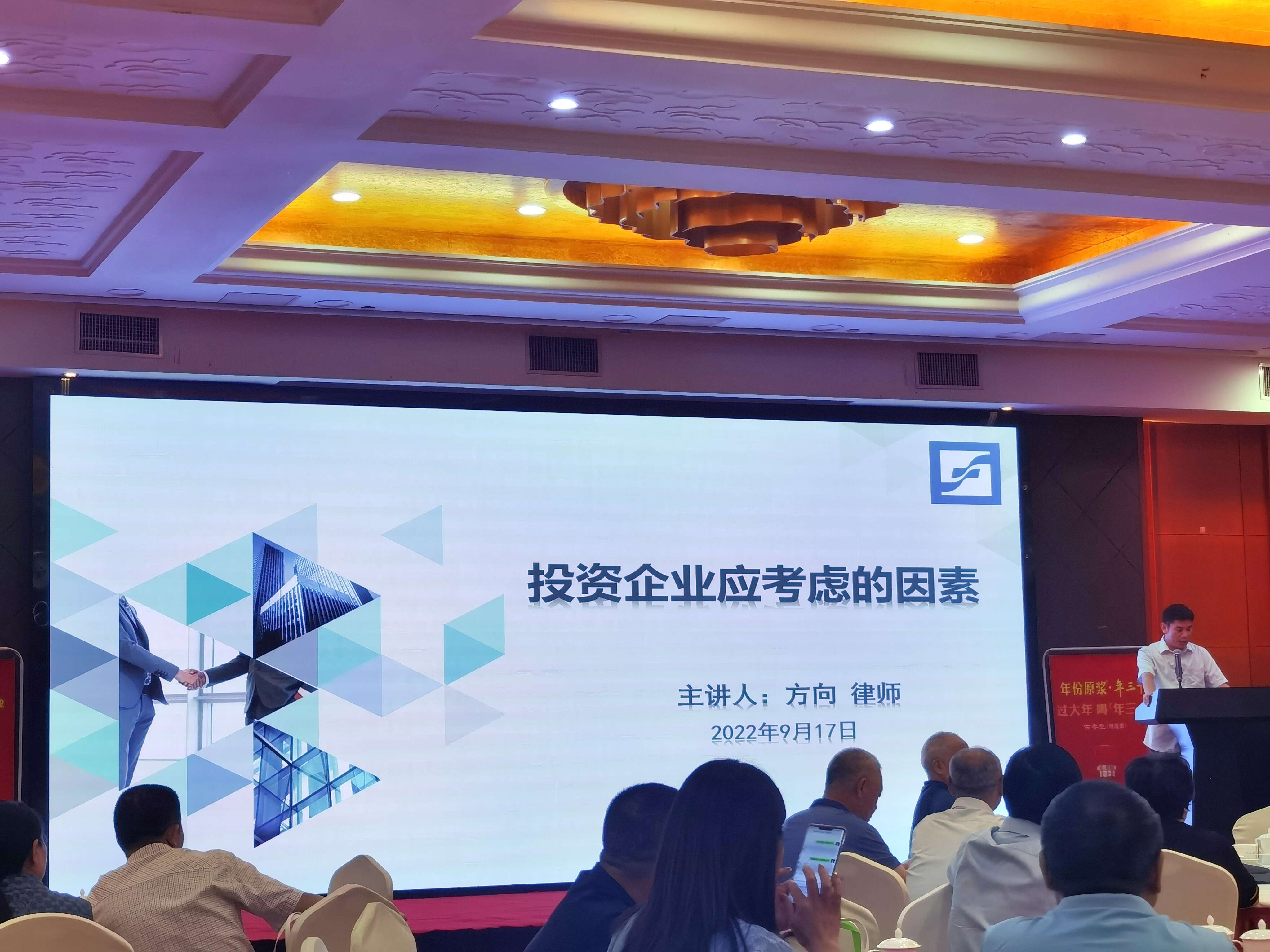 9月17日下午,芜湖枞阳经济文化促进会三届二次会员代表大会在海螺大酒店召开。文化与法律学院法学教研室方向老师应邀作了题为《投资企业应考虑的因素》的法律讲座。现场约有一百八十余名会员及嘉宾聆听了本次讲座。