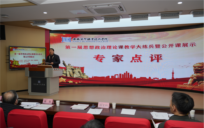 为深入推进习近平新时代中国特色社会主义思想和党的二十大精神进教材、进课堂、进头脑,大力加强学校思政课教师队伍建设,1月10日下午,马克思主义学院联合教务处、质量保障处共同举办的第一届思想政治理论课教学大练兵暨公开课展示活动在马克思主义学院思政课虚拟仿真体验教学中心拉开帷幕,学校党委委员、副院长郑承志,安徽师范大学教授、博士生导师、安徽省职业院校教师教学能力大赛指导专家路宝利,安徽机电职业技术学院党委委员、宣传统战部部长、马克思主义学院院长徐生,安徽工程大学马克思主义学院副院长刘德军,安徽信息工程学院马克思主义学院党总支副书记任晨晨,我校相关职能部门负责人及马克思主义学院班子成员,全体专兼职思政课教师、部分思政委员及学生代表参加了此次活动。