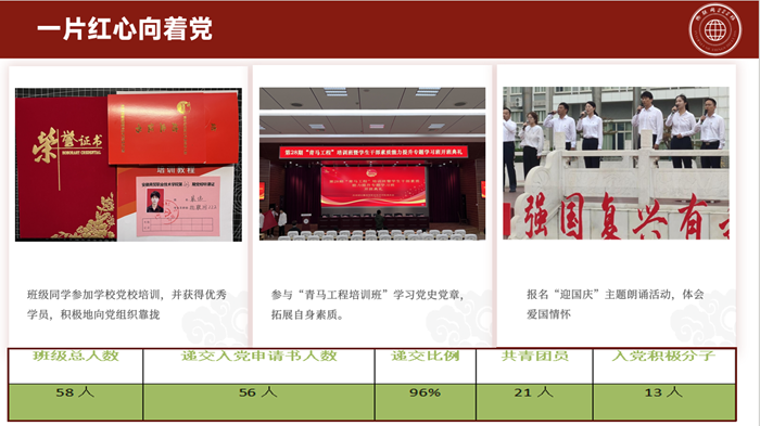 思想政治工作是一切工作的生命线。班级抓牢思想政治教育的主题主线,深入开展党史学习教育和入党启蒙教育,鼓励学生积极向党组织靠拢。组织观看党的二十大开幕会,开展“学习宣传贯彻党的二十大精神”主题团日系列活动。开展“晨读经典暮习书法”活动,努力打造商贸靓丽的人文名片,使百年底蕴的ky体育app官方校园在书声和墨香的浸润中绽放出新的璀璨华光。