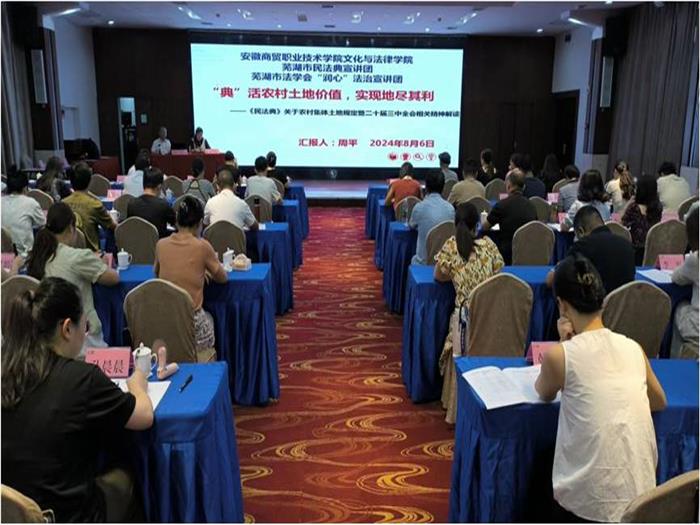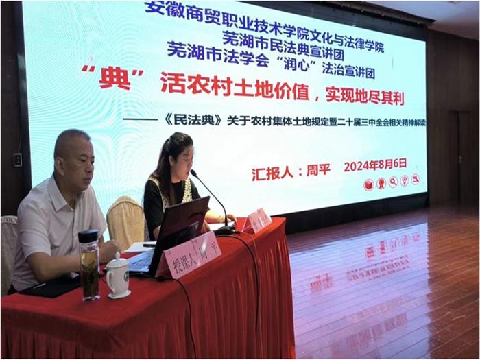 8月6日上午,应芜湖市司法局邀请,文化与法律学院周平老师为芜湖市普法骨干暨法律明白人示范培训班学员授课,宣讲《中华人民共和国民法典》及党的二十届三中全会精神。培训课由芜湖市司法局普法科科长徐露主持,来自全市各区、县、市基层近100名普法骨干暨法律明白人参加了培训。