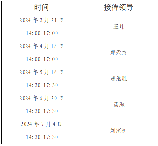 为进一步提高学校依法办学、民主治校和科学决策水平,拓宽学校领导与师生员工的沟通渠道,广泛听取师生员工意见和建议,切实解决师生员工的困难和问题,依据《中共kaiyun体育手机版登陆官网官方版正版下载委员会校领导接待日制度(试行)》(院党字〔2018〕45号)相关要求,现将2023-2024学年第二学期校领导接待日工作通知如下: