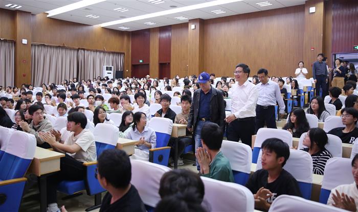 走进学术报告厅,贺东久一行饶有兴致地听起艺术设计学院党总支书记韩飚的美育讲座《浅析歌曲欣赏中的情与境》。贺东久来到同学们中间,热情洋溢地分享了自己创作的心路历程。他说,“我从小就特别想当诗人,时常在放牛时,脑海里想着写诗。如今你们正处在文学种子生根发芽的年纪,希望大家做人做事要做到坚韧不拔,多思考、多观察、多动手,以恒心和毅力写出时代的心声,写出心中的向往。”最后,贺东久饱含深情地告诉同学们:他愿做ky体育app官方学子的“校外辅导员”,希望同学们在文学和文艺创作中牢记“诗意、哲理、真情”六字,期盼可以见到更多同学的创作。饱含真情的发言赢得会场阵阵掌声。