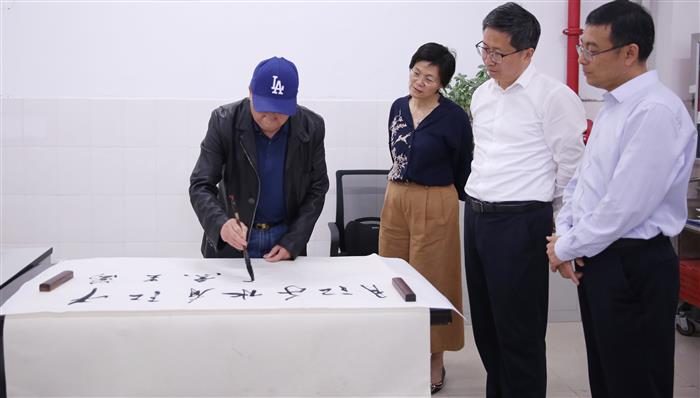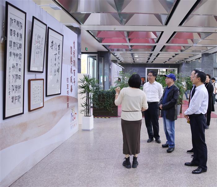 在艺术设计学院,贺东久一行先后参观了“百·廿征程创新与传承”建校120周年暨建院20周年原创艺术作品展、教师书画展以及国家级非遗——“芜湖铁画锻制技艺”创新成果展厅,不时在展板前驻足观看,仔细品读。